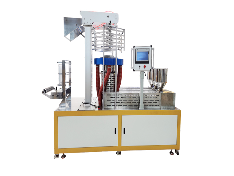 本机主要由主驱动电机、传动装置、挤出装置、加料斗、电控系统、吹膜模头、压延组、牵引、收卷等组成。物流从料斗里放入经过挤出装置的塑化和挤出变为熔融状态,再从主机经模头吹塑出来,通过两辊压延机进行压延、牵引、收卷。